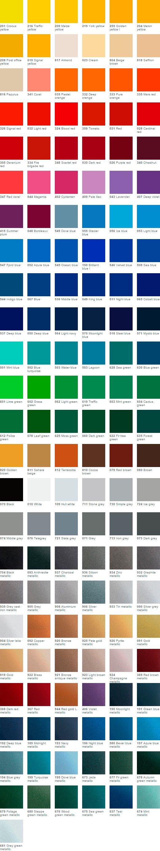 • 97 цветов с высоким уровнем блеска, белый и черный матовый