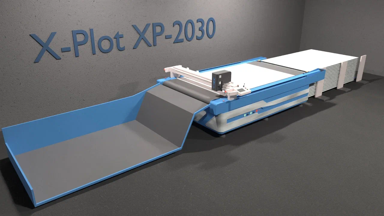 Плоттер оснащен проектором для позиционирования макета для резки на куске материала, осциллирующим ножом, пробойниками отверстий. Рабочее поле: 3600x1600 мм.